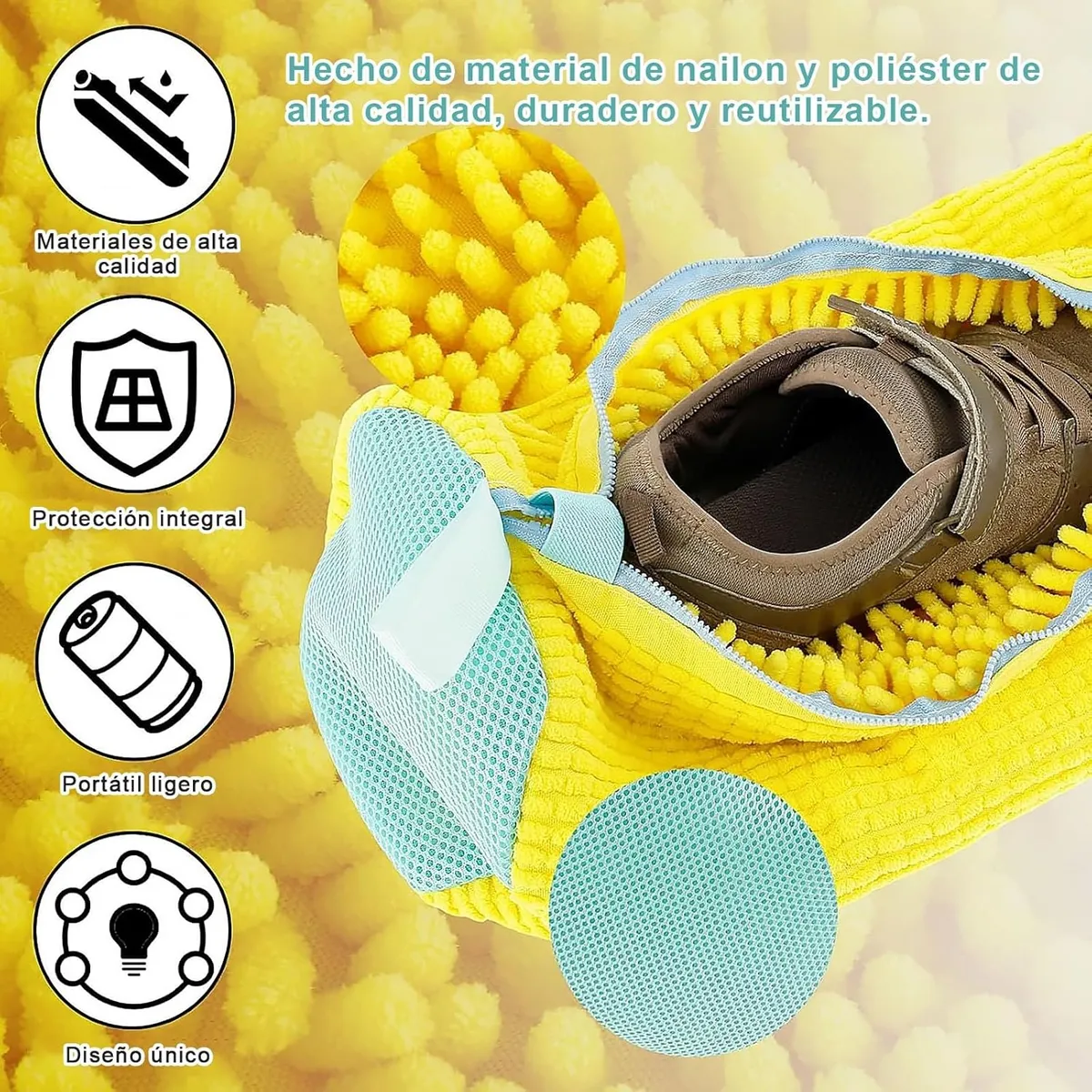 Por dentro tiene hebras que limpian en profundidad sin maltratar el material. Es suave con el calzado pero fuerte con la suciedad. Ideal para tenis blancos, deportivos, casuales y hasta zapatos escolares. Solo pones los zapatos dentro, cierras, y la lavadora se encarga del resto sin golpes ni pelusas.